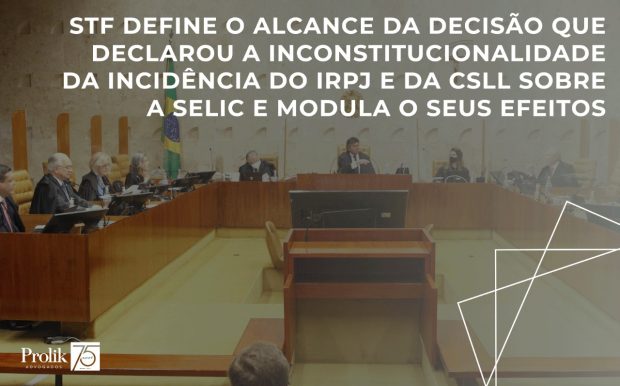 No que diz respeito à modulação, a decisão produzirá efeitos ex nunc, a partir de 30/09/2021, data da publicação da ata de julgamento do mérito, ficando ressalvadas as ações ajuizadas até a data do início do julgamento (17.09.2021) e os fatos geradores anteriores a 30.09.2021 em relação aos quais não tenha havido o pagamento do IRPJ ou da CSLL a que se refere a tese de repercussão geral. Ou seja: a União não poderá cobrar tais valores e quem propôs a medida judicial antes de 17.09.2021 pode, após o trânsito em julgado da respectiva ação ou se possuir decisão judicial favorável, ainda que não transitada em julgado, deixar de recolher o IRPJ e a CSLL sobre a Selic recebida em repetições de indébito e aproveitará o indébito relativo aos últimos cinco anos.